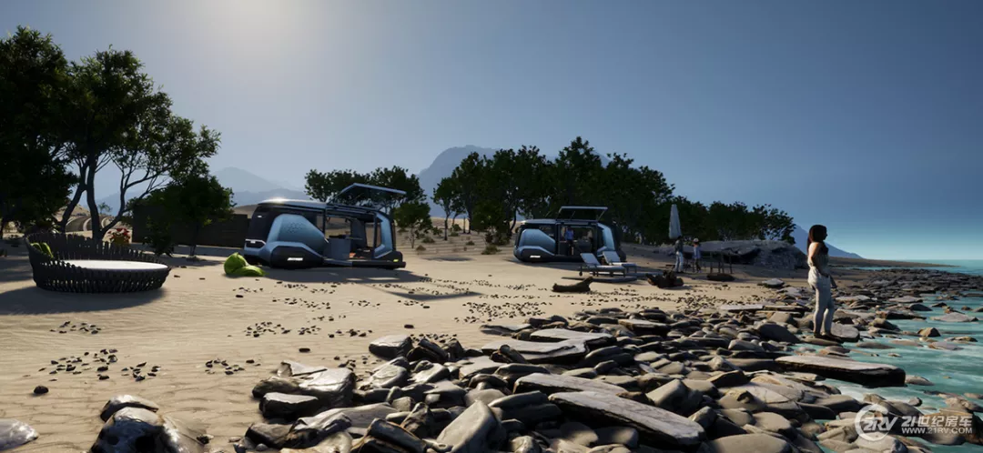 抛开无人驾驶,对这台房车其他设计还是有挺多的亮点,侧车门是一个向外向上推开的玻璃门,底部可以向往推出一个露天大平台,可以把厨房移到外面平台上。